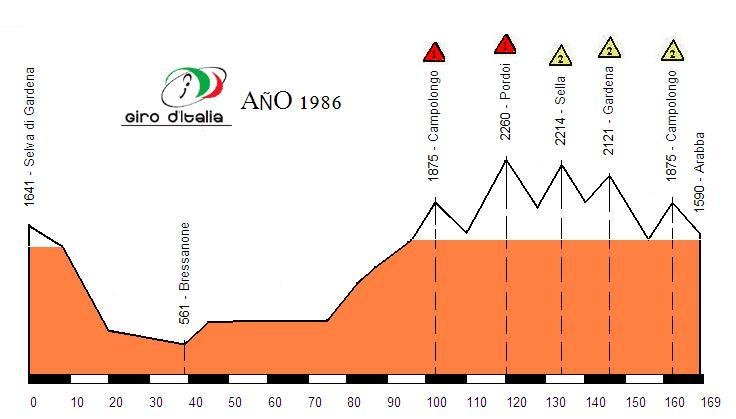 Los Dolomitas siempre han tenido cabida en el Giro. En esta etapa del ’86 no se superaban las vertientes más duras de algunos puertos, pero el encadenado de los mismos es igualmente espectacular.