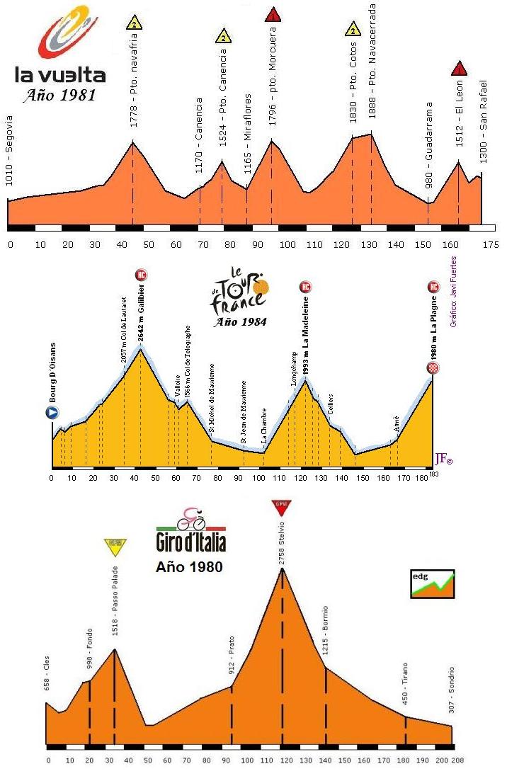 Al mismo tiempo, el Giro pasa por una época muy peculiar en que los corredores italianos más importantes, Saronni, Moser y Visentini, se caracterizan por no ser buenos escaladores y por lo tanto los recorridos se diseñan pensando en ellos. El Giro está perdiendo prestigio debido a la suavidad de los recorridos mientras que la Vuelta avanza gracias a ese incremento de dureza comentado y por supuesto a la televisión en directo.