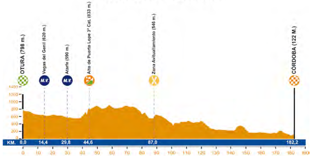 Hasta Córdoba partirá el pelotón al día siguiente desde la granadina localidad de Otura en un envite que tiene visos de dilucidarse al esprint, a menos que se produzca –y no sería de extrañar visto lo visto en otros años- una fuga consentida que alcance la gloria en las calles de la ciudad califal. Si bien en Córdoba se pueden hacer finales espectaculares gracias a las múltiples vertientes de la conocida subida a San Jerónimo (la más dura, conocida como «el 14%» aun sigue inédita), en el contexto de esta vuelta, siendo la única llana, no parece necesario incluir dureza.