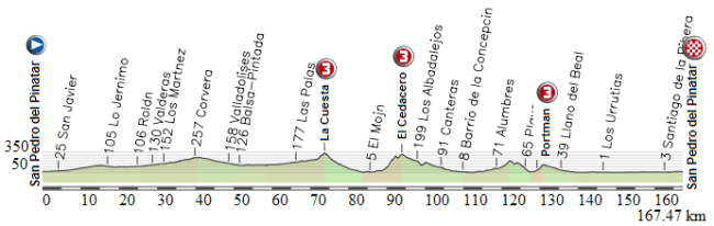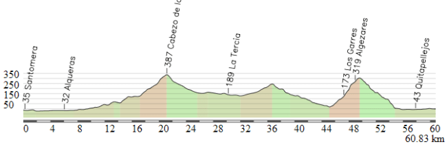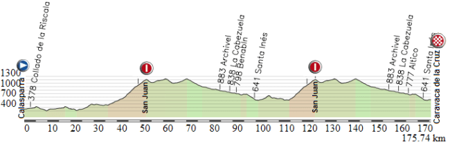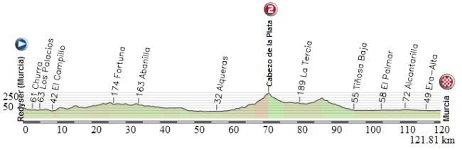 Tras la bajada de El Garruchal se podía haber subido a la Cresta del Gallo o a la Fuensanta pero se ha optado por un final de etapa muy llano y un paso por el pueblo de Alcantarilla que parece metido con calzador, suponemos que por razones económicas. De haberse subido la Cresta del Gallo y haber obviado el paso por Alcantarilla tendríamos una etapa con muchas posibilidades de cambios en la general, pero con el recorrido previsto veremos un esprint masivo casi, casi seguro.
