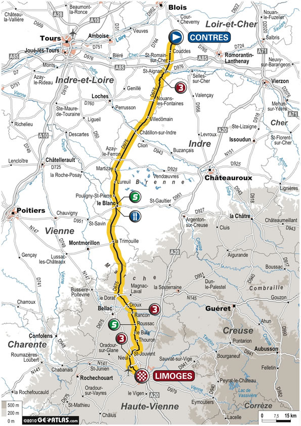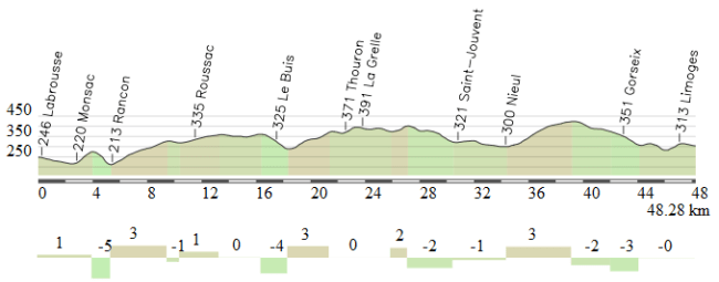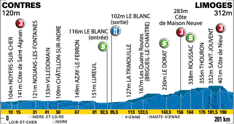 En principio parece una etapa abocada al sprint (aunque de un pelotón reducido), pero seguro que hay múltiples intentos de fuga … y no sería raro que algun corredor consiguiera sorprender en los últimos km y vencer en solitario. De hecho en 2007 se llegó también a Limoges después de Nieul (aunque la entrada a la ciudad se hizo por una sitio distinto, picando los 2,5 km finales hacia arriba) y F.Pellizzotti fue el ganador, llegando con 2 segundos de ventaja sobre un pelotón de unos 40 corredores.