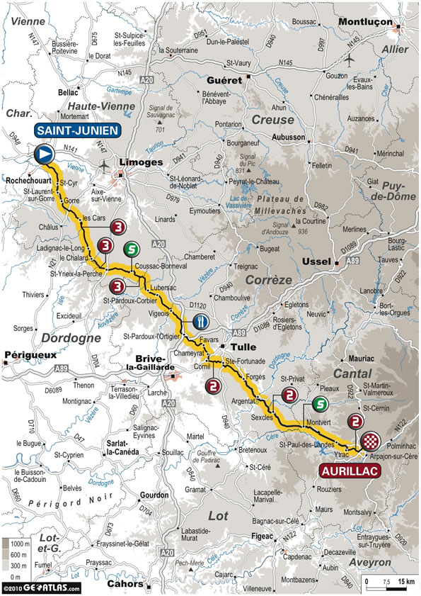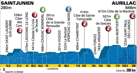 Los primeros 120 km están plagados de repechos y varios pequeños puertos, sin prácticamente respiro pero tampoco subidas de mucha dureza. Será a partir de la localidad de Chaymerat cuando se afronten los 2 puertos serios de la etapa, Sainte Fortunade y Sexcles, con 17 km llanos entremedias. Una vez coronado este último (no exactamente donde está marcado el puerto, ya que sigue subiendo) quedarán algo menos de 40 km hasta meta. Una pena que este terreno final sea bastante facilón, con sólo pequeños repechos y la subida a la cota de Martinie, a 3 km de la llegada. Los últimos km son idénticos a los del campeonato de Francia 2007, con victoria para C.Moreau.