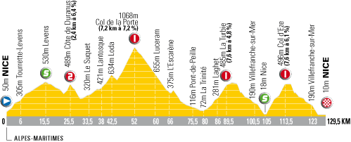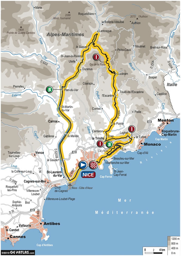 La etapa por sí sola no está nada mal, con 3 puertos bastante seguidos (sobre todo los 2 últimos) y final después de bajada. El problema es que de tanto repetirla los corredores se la conocen al dedillo. De hecho es idéntica a la etapa del 2009 y muy parecida a la del 2008. Encima es la versión blanda, ya que en ediciones previas se hicieron etapas parecidas pero más selectivas, destacando especialmente la de 2007, con un terreno más duro antes de Porte y el Col d´Eze entero, no «capado» como ahora. Las etapas de 2005-2006 fueron muy similares, pero con un tramo llano entre Turbie y Eze.