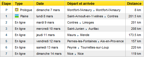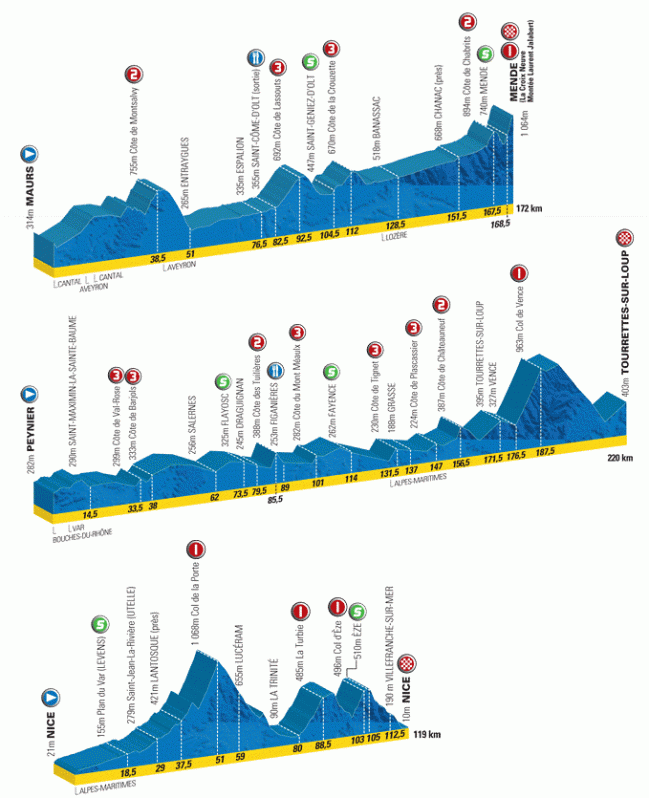Dejando de lado el prólogo, la carrera va claramente de menos a más, con las 3 etapas a priori decisivas situadas en la segunda parte del recorrido: dura llegada a Mende, larguísima etapa con Vence y multitud de pequeños puertos camino de Tourretes Sur Loup, y la tradicional jornada final en Niza. Eso sí, los favoritos no pueden confiarse ya que las primeras etapas también tienen su dificultad, que se verá muy aumentada si hace mal tiempo.
