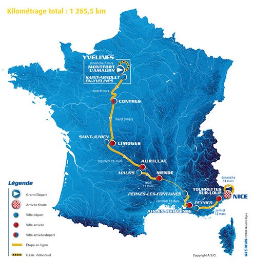 La París-Niza 2009 tuvo una estructura parecida a la de 2008, pero los organizadores volvieron a sorprender con el estreno de otra gran ascensión: Montagne de Lure (aunque igual que el Mont Ventoux oeste el año anterior, «capado», hasta la cota 1600 m), un puerto muy interesante tanto para esta carrera como para el propio Tour de Francia. Ademas le dieron una vuelta de tuerca a la penúltima jornada, terminando en Fayence despues de un «serrucho» de media montaña. Sólo fallaba un poco la etapa final, con puertos bien encadenados pero muy repetitiva respecto a otros años (y en la zona hay opciones mucho mejores, que comentaremos en el análisis etapa por etapa) y quizás una crono inicial un pelín mas larga. Pero más allá de estos detalles, un trazado de notable alto. Y al igual que había sucedido en 2008, la conjunción de un gran recorrido y la actitud ambiciosa y valiente de los corredores dieron lugar a una carrera espectacular, de lo mejor que se ha visto en la última década. Teniendo en cuenta esos antecedentes, no es de extrañar que la edición de este año sea esperada con grandes expectativas.