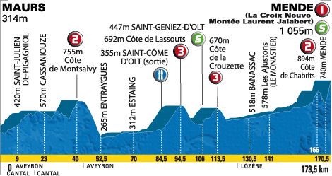 - Mende-La Croix Neuve/Montée Laurent Jalabert -hasta el cruce del aeropuesto-, 1ª (Meta): 3 km – 10,7 % (aunque se contradicen con su perfil oficial: 3,1 km al 10,1%)