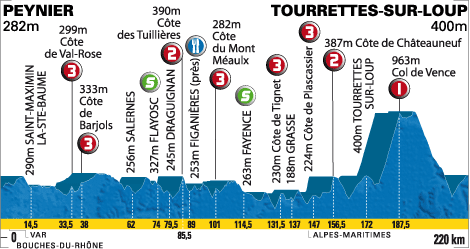 La etapa reina de la carrera, al menos por dureza acumulada. Y es que a pesar de no tener un final tan duro como Mende o puertos tan conocidos como la jornada de Niza, cuenta con un largo kilometraje (220 km) lleno de repechos y un buen puerto como Vence situado en el punto justo para romper.
