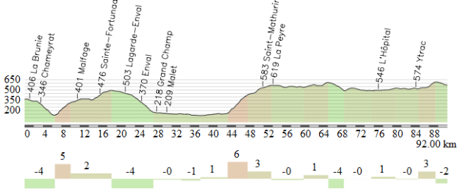 Ya de salida el terreno pica arriba, para después de un tramo de repechos afrontar el primer puerto: la cota de Montsalvy (4,2 km al 6%). Una vez coronado, largo descenso y unos 20 km llanos antes de los 2 siguientes puertos, Lassouts y Crouzzette, ambos bastante tendidos. Después de la bajada de este último el recorrido se suaviza, con nada menos que 45 km prácticamente llanos. La más que previsible escapada tendrá que apretar en este terreno si quiere llegar a la parte final de la etapa con opciones.