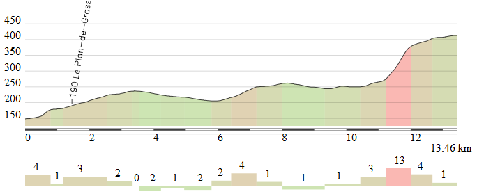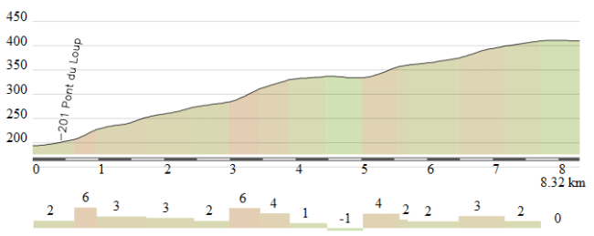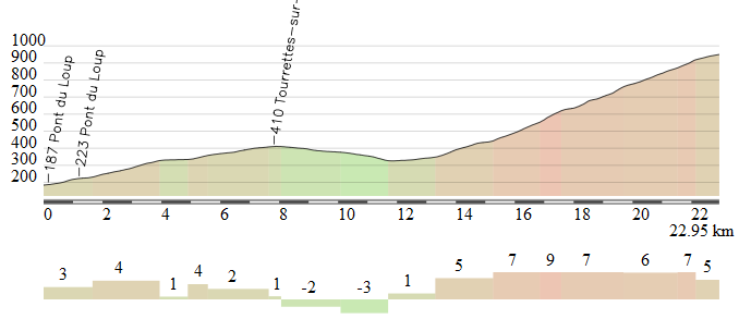 Al llegar al cruce de Pount Sur Loup, a poco mas de 8 km de la llegada, comenzará la subida final a Tourretes. La meta no está exactamente en el alto, sino que se llanea durante un km aproximadamente.