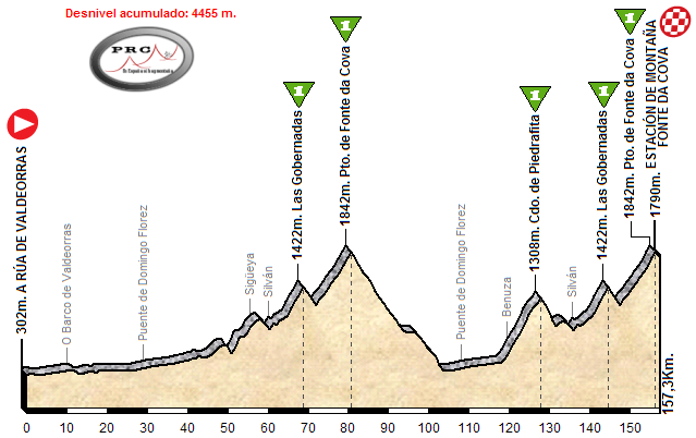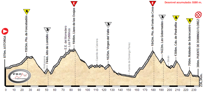 En la etapa se subirían las dos vertientes más duras tanto del Llano de las Ovejas como del Pto. de Fonte da Cova. Pero lo mejor es sin duda el final de etapa: Fonte da Cova debería romper la carrera debido a su dureza y al tremendo desgaste anterior, y de ahí hasta meta se intercalan vertiginosas bajadas con duros puertos. Primero, Gobernadas son 3 Km. a algo más del 7 %, y hay dos repechos más antes de empezar a subir al Cdo. de Piedrafita: 4Km. siempre rondando el 10% y rampas de hasta el 19%. Su bajada es la más larga de la parte final, y daría paso al corto Robledo de Sobrecastro, un «muro» al 11,2%. Rapidísima bajada y ya solo un pequeño llano quedaría hasta la línea de meta.
