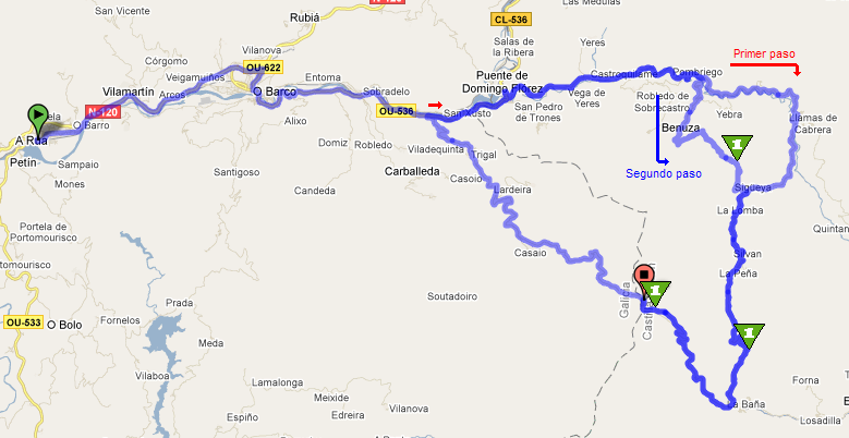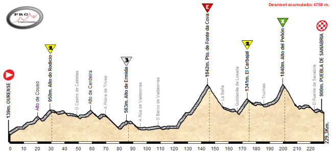 Saliendo de Ourense se afronta de primeras la larga y discontinua subida al Alto do Rodicio, que sin presentar dureza si sería un gran filtro para las escapadas. Además, el terreno que la sigue es también quebrado hasta que se llega a A Rúa tras pasar por el Alto de Ermida. Entonces unos 30Km. llanos nos llevan al inicio del «coco» de la jornada.