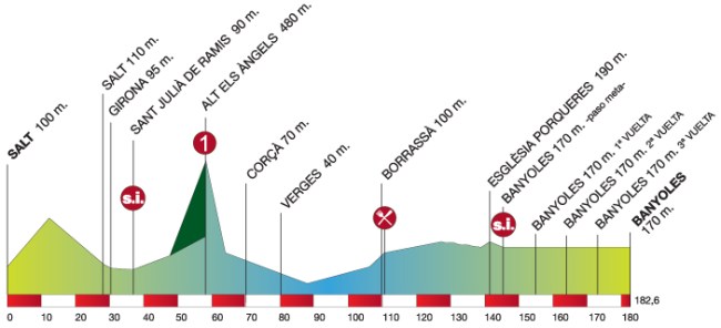 Se trata de una etapa básicamente llana, con una única dificultad montañosa, el Alt Els Angels, en el kilómetro 58 de la etapa. La organización ha catalogado este puerto de primera categoría, aunque en realidad a duras penas se le puede considerar algo más que un simple tercera. La etapa tiene toda la pinta de resolverse al sprint, pero tratándose de la primera jornada en línea es normal que el recorrido no se endurezca en exceso. Además los 30km finales de la etapa discurren por un circuito llano en torno al Lago de Banyoles al que se darán tres vueltas, lo que de cara a la promoción turística de la zona nos parece muy adecuado.