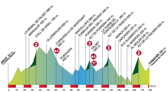 Etapa 5: Viernes, 26 de Marzo de 2010, ASCÓ – CABACÉS, 181,2 Km. Rutómetro Dificultades montañosas: