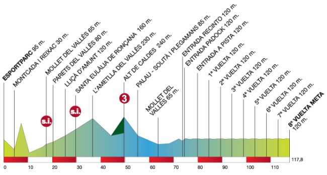 La Volta termina con una jornada clara para el sprint, en la línea de meta del Circuit de Catalunya. En teoría será la segunda y última jornada para el sprint masivo de la prueba, tras la etapa con final en Banyoles. La única dificultad puntuable de la jornada, el Coll de Caldes, se encuentra en el kilómetro 50, y en principio no debería suponer ningún quebradero de cabeza para un pelotón bien organizado, más aún en una etapa de 120km de recorrido. Habrá que ver como sopla ese día el viento, que suele ser habitual por la zona, pero todo parece indicar que será una clara jornada de transición y un homenaje al ganador de la ronda.