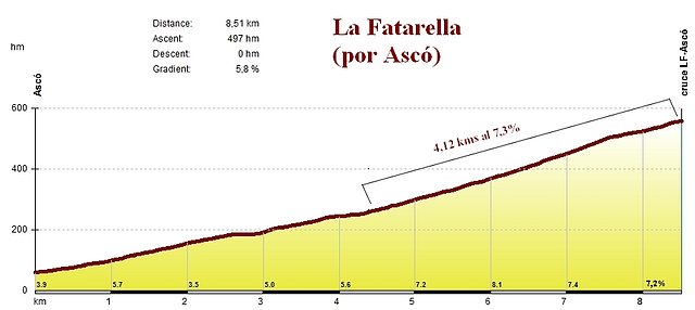 El Alt de Paumeres – La Fatarella, que se asciende dos veces en la 4ª etapa con final en Ascó, es uno de los puntos más selectivos y propicios para los ataques de la carrera. Perfil de mikmik44