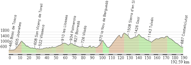 La etapa reina, dura pero mejorable y con un perfil muy inflado. De salida se pasa por el tunel de Bracons en vez de subir el puerto y luego se evitan Pradell y Fumanya.