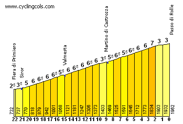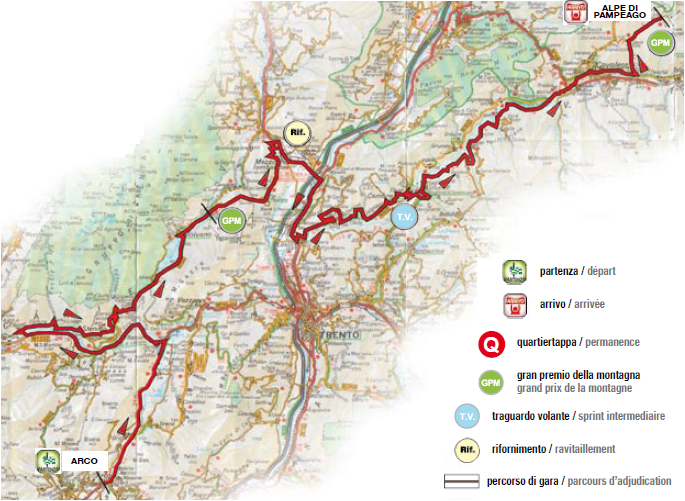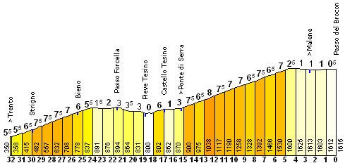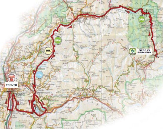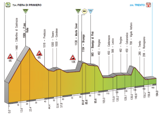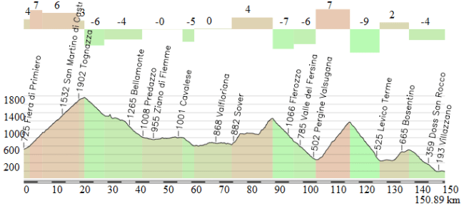Versión dura de la etapa, con Rolle (1), Monte Sover (3), Redebús (2), Vetriolo Terme (1) y Vigolo Vattaro (3) antes del final directo en Trento.