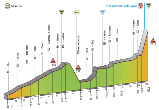 4ª ETAPA (Vierbes 23 Abril): ARCO – ALPE DI PAMPEAGO (TESERO) (172,1 km). Rutómetro / Últimos km.