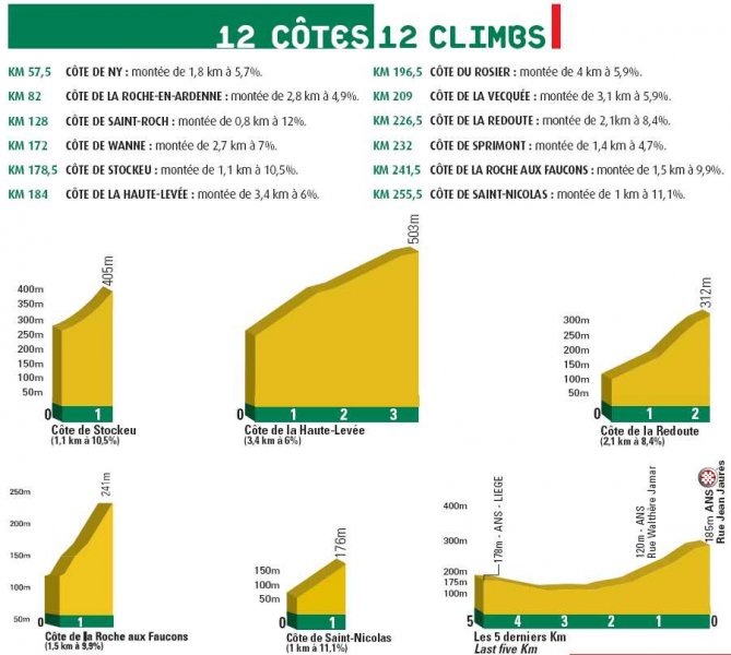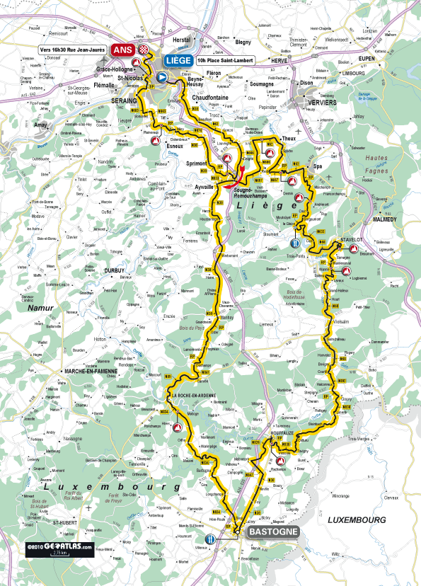 En cuanto al recorrido, se mantiene la dura trilogía que se vió en 2008 y 2009, La Redoute – Roche Aux Faucons – Saint Nicolas, antes del final en Ans, pero la dureza previa ha disminuido ya que justo en el tramo anterior los organizadores han suprimido una de las cotas más largas de la prueba: Haute Levée. Además la parte inicial de la prueba es más sencilla, perdiendo entre otras subidas la cota de Ny. Otro cambio es la sustitución de la cota de Vecquée -últimos 3 km- por las cotas de Maquisard y Mont Theux, subidas clásicas de esta carrera de 1974 a 1988 (Mont Theux también es famosa por el ataque de Miguel Indurain en una etapa del Tour 1995). En el caso concreto de Haute Levée, si su exclusión ha sido por obras en la carretera, lo que no no tiene mucho sentido es que no hayan incluído otra cota a cambio,  ya que se reduce el desgaste pocos km antes del inicio de la parte decisiva.