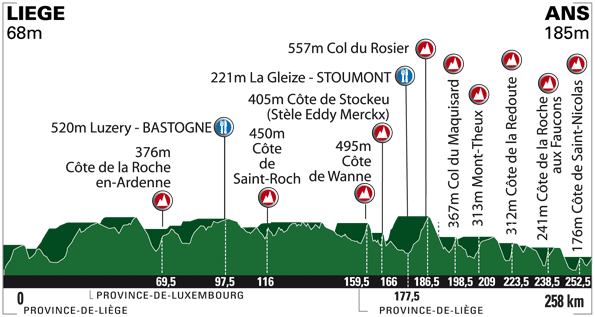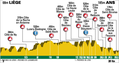 Parte final de la clásica, con la Redoute, Sprimont, Roche Aux Facons, S.Nicolas y llegada en Ans