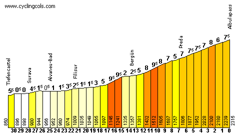 A partir del paso por Tiefecanstel la carretera empieza a picar hacia arriba, subiendo «a escalones», aunque no será hasta unos km más tarde cuando comience la verdadera ascensión al Albulapass. La parte inicial es muy irregular, con 2 km durisimos y también falsos llanos, pero después de la localidad de Bergün ya casi no hay respiro hasta la cima, con 12 km finales al 7,4% de media y muy escénicos. Teniendo en cuenta el desgaste previo y la propia dureza de la subida, lo normal es que el grupo de favoritos se rompa completamente.
