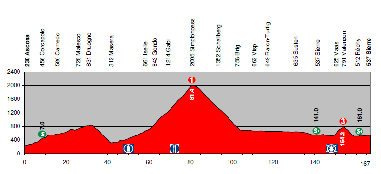 La primera etapa en línea de la Vuelta a Suiza 2010 une las localidades de Ascona y Sierre, en una jornada que se puede considerar de media montaña por el puerto Valencon, un 3ª duro/2ª blando a unos 13 km de meta … aunque también se asciende un «gigante» como Sempione a mitad de la etapa.