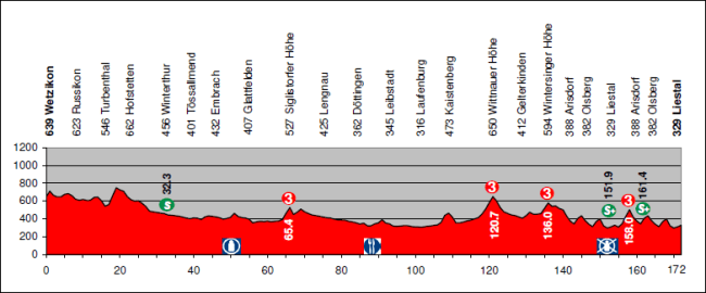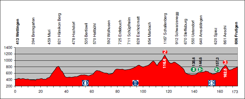 Los primeros km son muy pestosos, con varios repechos (uno muy duro de salida) y el pequeño puerto de Girenbad, no puntuado pero con 2,1 km al 8,2%. Terminada esa ascensión, el terreno será bastante favorable durante los siguientes 90 km, con Siglistofer Höhë como única dificultad reseñable: 2,8 km al 5,7%.