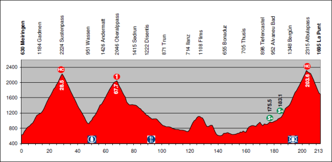 Así quedaría el encadenado Lenzerheide (1) + Albula (Es) a partir de Tamins. Manteniendo la salida original, Meiringen, el kilometraje total de la etapa sería de 217 km.