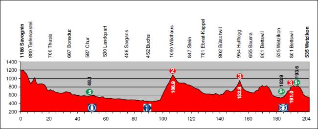 El inicio de la etapa (km 29 a 36 del perfil) es bastante movido, con una fuerte bajada hasta llegar a Tiefecanstel seguida del repecho de Avaschein y su irregular descenso hacia Thusis. A partir de ahí el terreno cambia, con casi 80 km muy favorables para el pelotón. Será después del avituallamiento de Buchs cuando el trazado se complique con el puerto de Wildhaus, 9 km a casi el 7 % de media.