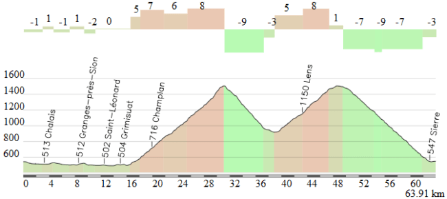 Desde la cima hay una larga bajada hasta la localidad de Brig, dando paso a 45 km casi completamente llanos en los que se hará un primer paso por la meta de Sierre (km 141). En los últimos 20 km de la etapa el trazado volverá a endurecerse con el ascenso a Valencon, de sólo 4,2 km pero con tramos muy exigentes.