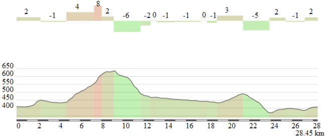 - Girenbad, np (km 18,6): 720 m – 2,1 km – 8,2 %