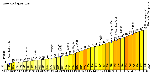 Los primeros 32 km pican constantemente hacia arriba, hasta la localidad de Druogno, en territorio italiano, donde se inicia un tramo de descenso hacia la localidad de Masera. A partir de ahí enseguida empieza la ascensión al Simplonpass/Passo del Sempione, primero de un modo suave, casi como un falso llano ascendente, pero al poco de entrar en Suiza se endurece la pendiente, con un tramo de 20 km al 6,3% y coronándose el puerto por encima de los 2.000 m de altitud.
