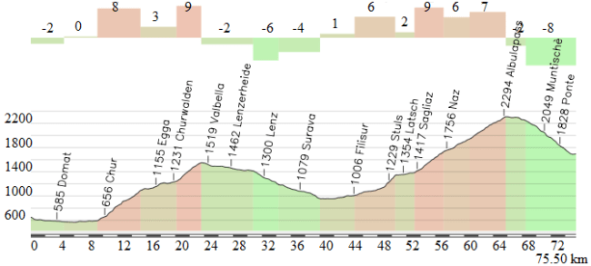 - Flims, np (km 125,9): 1.109 m – 7,6 km – 5,2 %