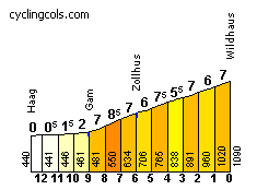 - Hulftegg -incluye repecho previo-, 3ª (km 153,8): 954 m – 5,6 km – 5 %