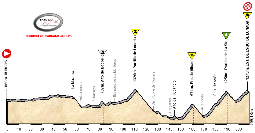 Saliendo de Burgos se inicia un recorrido habitual en La Vuelta, atravesando el Alto de Bocos para luego entrar a Cantabria por el Portillo de Lunada. Su larga y técnica bajada nos deja en Liérganes, donde se sube un pequeño repecho hacia Rucandio, empezando entonces la zona decisiva de la etapa. El habitual encadenado de Alisas y La Sía se hace esta vez en sentido contrario al habitual, pasándose así un 2ª largo como el Pto. de Alisas (9,6 Km. al 6%) justo antes del Portillo de La Sía, punto clave de la jornada para realizar ataques. Tras coronarlo, se entra de nuevo en Burgos para afrontar una rápida bajada que nos deja a los pies de la ascensión final del día. La primera parte de la misma coincide con la carretera de Lunada y tiene algo más de 5Km. al 5,6%. La segunda viene tras desviarse hacia la estación y afrontar una pequeña bajada que precede al tramo más pendiente: 1,6 Km. finales al 7,6%.