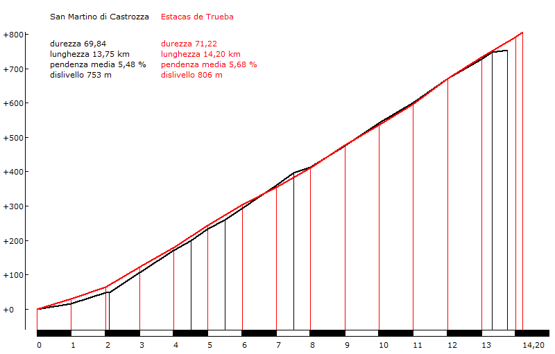 Como comparativa hemos utilizado el final en alto de San Martino di Castrozza, que se ha visto en el Giro de Italia y el Giro del Trentino, y que refleja fielmente como es Estacas de Trueba: bastante largo, y de pendientes mantenidas no muy elevadas.