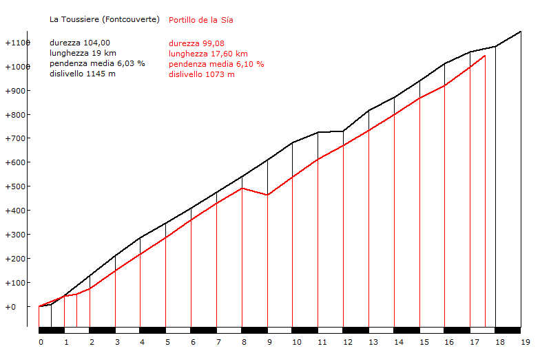 Buscando una comparativa gráfica con el Portillo de La Sía para apreciar mejor sus características, hemos elegido La Toussuire, que ha sido final de etapa tanto en el Tour como en Dauphine. Si bien La Sía sale «perdiendo» esto se debe casi exclusivamente al kilómetro de bajada tras el Asón, ya que el resto mantiene una pendiente muy similar.