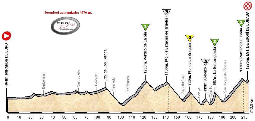 La etapa más larga de las propuestas, y la que más puertos de 1ª cat. tiene, y quizá por ello la que tiene más «aire» de alta montaña. Los primeros 90 Km. llanos nos llevan hasta el Pto. de los Tornos, que por esta vertiente no es más que un ligero falso llano. Su bajada nos deja al inicio del Portillo de La Sía por la vertiente de La Gándara, iniciándose así una tremenda sucesión de puertos que no terminará hasta meta. Tras la dureza de La Sía, se sube la tendida vertiente sur de Estacas de Trueba … pero su bajada es técnica por lo que no permite relajarse. La Braguía y Abionzo son el aperitivo perfecto para el puerto más rompedor de todos: La Estranguada, con sus brutales 3,2 Km. al 13,1%. Está situado en el punto perfecto para romper la carrera y resultar decisivo, ya que tras su pequeña bajada se asciende al más tendido Portillo de Lunada, que se corona a solo 4,5Km. de meta, de la que lo separan solo una mínima bajada y un repecho final de 1,6 Km. al 7,6%.