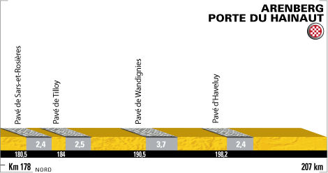 Pero es que incluso hay varias jornadas sin dificultades montañosas que podrían resultar decisivas (aparte de las cronos): Bruselas (1ª), muy favorable para que se produzcan abanicos, y Arenberg/Porte du Hainut (3ª), con el regreso del pavé al Tour … y no precisamente de un modo testimonial, con 7 sectores que suman 13,2 km sobre esta superficie (la mayoría en los 30 km finales de la etapa). Es una decisión atrevida por parte de la organizadores y esperemos que salga bien.