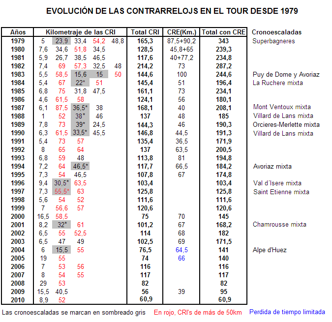 La reducción de las contrarreloj en el Tour ha sido exagerada en los 2 últimos años (si bien la tendencia ya era anterior), con las cifras más bajas de C.R.I. de los últimos 30 años, aunque es cierto que el año pasado había una C.R.E. que compensaba algo las cifras.