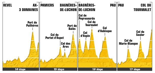 Cuestión aparte es la decisión de los organizadores de acabar una etapa en la cima del Tourmalet (aunque ya se hizo en 1974 -> clasificación). Nos parece un error, por la idea que se transmite al público y a los propios corredores de que para darle todo el protagonismo a una subida tiene que ser final en alto (cuando además el Tourmalet es mítico precisamente por lo contrario), pero entendemos que es una cuestión más de concepto que deportiva. Eso sí, aunque no fuera el Tourmalet, el hecho de que la llegada más dura sea justamente la última etapa de montaña puede condicionar negativamente la carrera, haciendo que los corredores sean más especuladores en las jornadas previas.