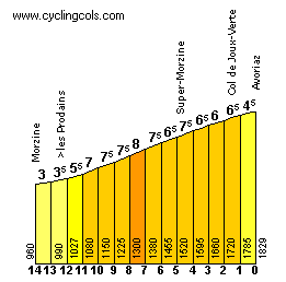 Después de coronar, fuerte descenso (primeros 9 km) en busca del cruce con la carretera principal (D-902) y el pequeño puerto de Les Gets: 4,3 km al 4,8% de media pero con un km a más del 6%. La tendida bajada de Les Gets dejará a los corredores en Morzine, habitual final de etapa del Tour pero que en esta ocasión es el inicio de la última subida del día, Avoriaz: 13,6 km al 6,1% según datos oficiales. No tiene rampas muy duras pero si es bastante constante en torno al 7%, aunque el inicio y final, más suaves, bajan la media. *Perfil con % más detallados (aunque sólo hasta el cruce de Joux-Verte) -> click aquí.