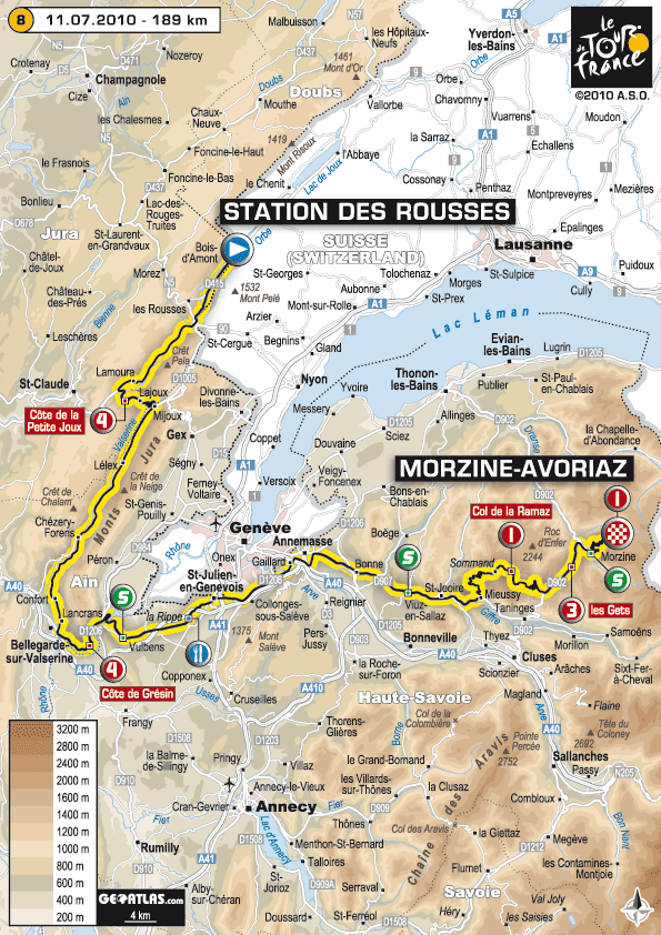 Después de 3 jornadas más o menos llanas el Tour 2010 cambia completamente el escenario, con una etapa de media montaña en el Jura que incluye 6 puertos y el últimos de ellos, Lamoura, a sólo a 4 km de la línea de meta en Station des Rousses.