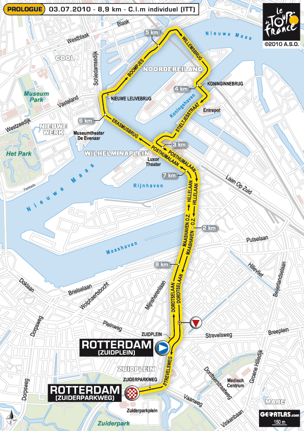 El Tour 2010, al igual que sucedió en la Vuelta a España 2009 y Giro de Italia 2010, inicia su recorrido con una contrarreloj individual en tierras holandesas, en este caso en la ciudad de Roterdam: el puerto más grande de Europa (y el 2º del mundo, sólo por detrás de Singapur). Situada a las orillas del Río Mosa, es a su vez la segunda localidad más importante de los Países Bajos y su corazón industrial.