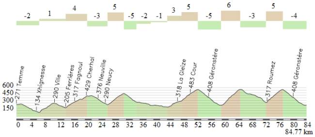 Los 90 km iniciales de la etapa son bastante sencillos pero pasado el avituallamiento de Amspin/Amay empiezan las dificultades, con la Côte de France, 2,2 km al 6,2%, Después de coronar no hay descenso propiamente dicho sino un terreno de falsos llanos hasta llegar a Ouffet (km 117). A partir de ahí, suave descenso y comienza la «fiesta»: 6 pequeños puertos en los últimos 75 km de la etapa.