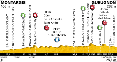 En vísperas del primer bloque montañoso, los corredores tendrán que afrontar la etapa más larga de toda la carrera: 227,5 km entre Montargis y Gueugnon, final de etapa inédito en el Tour.