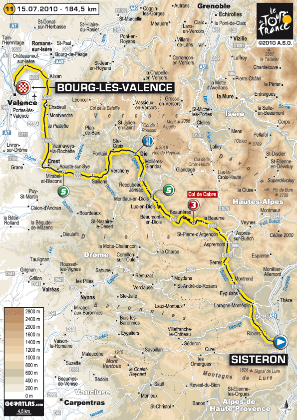 Después de 4 etapas de montaña (aunque con jornada de descanso entremedias) llega una etapa llana de 184 km entre las localidades de Sisteron y Bourg Lés Valence. La única dificultad montañosas es el Col de Cabre, aunque sin especial dureza y a casi 130 km de la llegada.