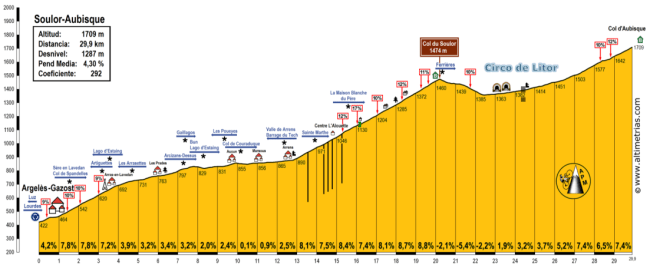 El último puerto del día será la ascensión al Col de Soulor + Col d´Aubisque -> historia.En los últimos años el Tour ha marcado ambos puertos por separado pero en esta edición, y con motivo del centenario de la Pirineos, contará como uno solo, con más de 1.400 m de desnivel acumulado en casi 30 km. Lo más duro es la parte final del Soulor, con 7,4 km al 8%, aunque después de coronar este puerto todavía quedarán casi 10 km hasta llegar al Col d´Aubisque, con 3 tramos muy diferentes: 2 km de bajada, subida tendida atravesando el espectacular «Cirque du Litor» y 3 km finales bastante exigentes (al 7%). El perfil del cyclingcols es un pelín distinto, con la parte inicial del Soulor más blanda pero la final del Aubisque más dura.