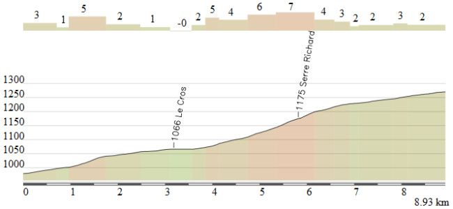 - Col de Manse, np (km 166,5): 1.270 m – 8.9 km – 3.3 %