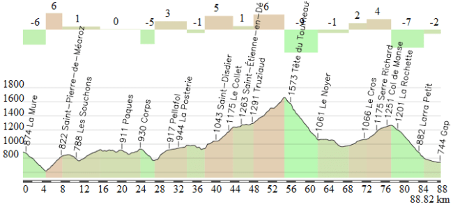 Los primeros 50 km no tienen dificultades reseñables, pero al paso por la localidad de Giéres empieza a cambiar el terreno, con la suave ascensión a Uriage Les Bains (no puntuada por la organización) … aunque no será hasta después del descenso de esta cota y un pequeño tramo llano cuando la etapa enseñe de verdad sus «colmillos», con la dura subida a Laffrey. Está muy lejos de meta (se corona a 102 km) pero es un lugar magnífico para movimientos tácticos de los equipos y que «segundos espadas», o favoritos que hayan perdido tiempo en las etapas previas, busquen meterse en una escapada.